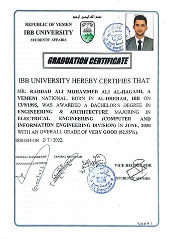 Bachelor’s Degree in Electrical Engineering (Computer and Information Engineering Division) From 2015/2016 To 2019/2020 Ibb University